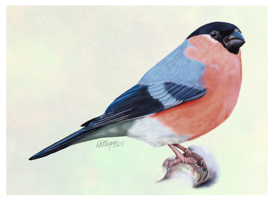 The Bullfinch (Pyrrhula pyrrhula) is one of Britain’s most striking finches, renowned for the male’s vivid rose-red breast and cheeks, contrasting with a jet-black cap and slate-blue back. This artwork captures its poised presence, perched delicately, showing off its strong, curved bill so well suited to feeding on buds and seeds.