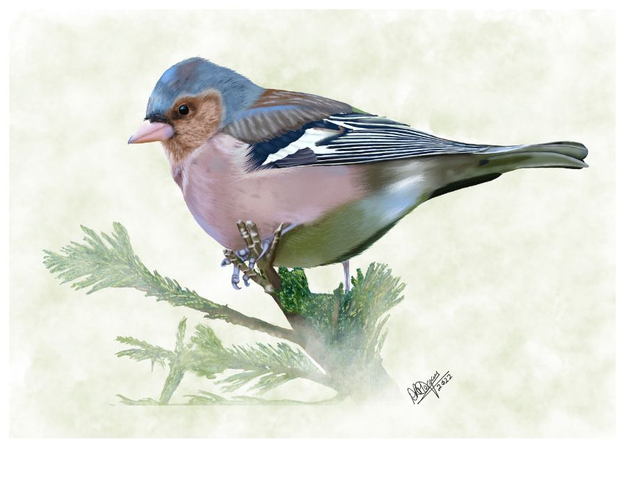 This artwork celebrates the beauty of the Chaffinch (Fringilla coelebs), one of the most widespread and colourful songbirds in Europe. Perched elegantly among evergreen foliage, the bird’s rosy-pink breast and cheeks blend seamlessly into its slate-blue crown and nape, while bold black-and-white wing markings add striking contrast. The artist has captured the softness of the plumage and the bird’s attentive posture with remarkable precision, creating a portrait that feels both lifelike and timeless.