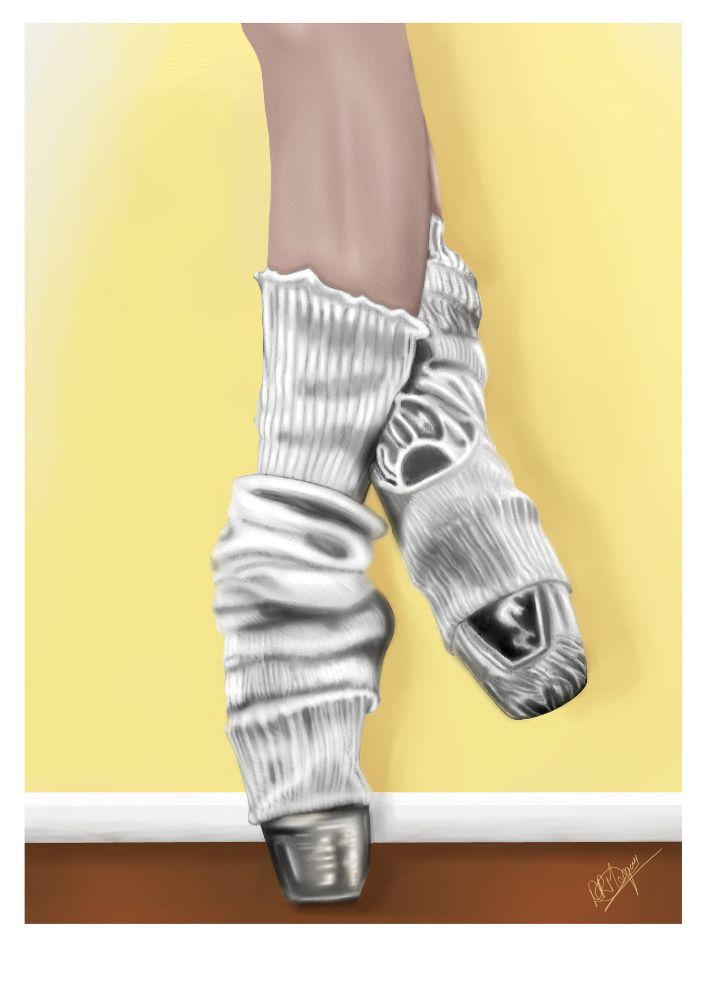 This striking artwork captures the raw beauty of ballet, as a dancer balances en pointe, their worn shoes wrapped in soft legwarmers. Every crease, stitch, and scuff tells a story of dedication, discipline, and the endless pursuit of perfection.