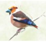 This striking Giclée print captures the Hawfinch (Coccothraustes coccothraustes), a bird of quiet power and rare beauty. Its massive bill, soft chestnut body, bold black markings, and flashes of sapphire-blue on the wings give it a regal and unmistakable presence. Perched with poised strength on a bare branch, the hawfinch seems both elegant and formidable.