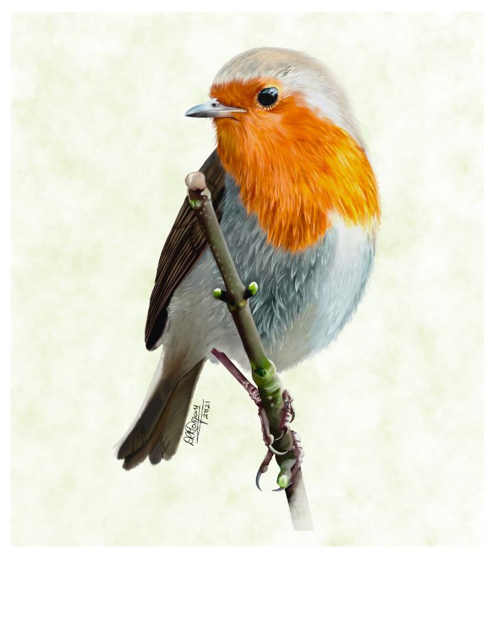 This evocative artwork captures the charm of the European Robin (Erithacus rubecula), one of Britain’s most cherished garden birds. Perched delicately on a budding twig, the Robin is shown in a moment of stillness after rain, its orange-red breast glistening with soft, damp tones against the muted grey of its underparts. The finely detailed plumage and watchful black eye reflect both resilience and vulnerability, a true portrait of this familiar yet ever-enchanting bird.