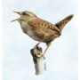 The Eurasian Wren (Troglodytes troglodytes) is a tiny bird with an enormous voice, often heard long before it is seen. Despite its small size, it sings with remarkable power, filling hedgerows, gardens, and woodland edges with bright, cascading notes. Here it is depicted mid-song, tail characteristically cocked, perched lightly as if commanding the stage.